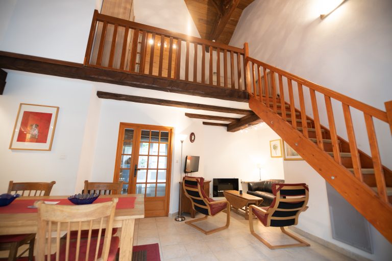 Au rez-de-chaussée – Terrasse avant, séjour, cuisine équipée ouverte, chambre (1 lit double) avec salle d’eau (douche, toilette et lavabo), terrasse arrière.